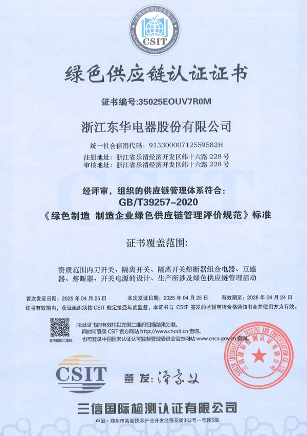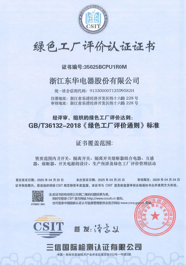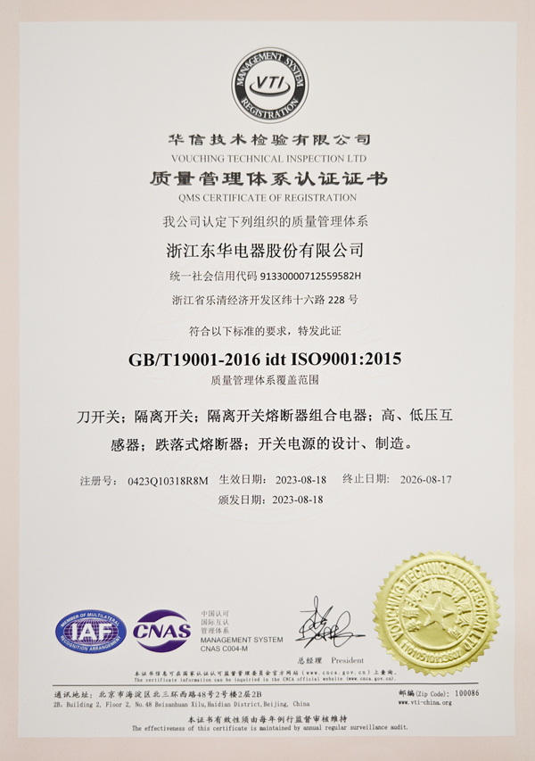公司始終堅持以“創行業品牌,造專業品質,展員工所長,為顧客所想,遵章守法、預防為主、持續改進、健康安全”的管理方針和“為顧客創造價值;為企業謀求發展;為社會承擔責任”的經營理念來指導公司的經營生產;公司分別通過了ISO9001質量體系認證、ISO14001環境體系認證、ISO45001職業健康安全管理體系認證和兩化融合體系認證,生產產品擁有UL、CB、TUV、CE、CSA、KC、ERP、CQC認證和強制性產品認證自我聲明等認證及計量生產許可證,并符合ROHS生產管理要求及擁有出口自營權。東華電器作為專業制造的品牌產品銷售全國各地和亞、非、歐、美及東南亞等多個國家,深受用戶好評,連續多年被政府部門及上級主管部門評為《國家高新技術企業》、《浙江省科技型中小企業》、《先進企業》、《優秀企業》、《中國鄉鎮明星企業》、《浙江省新千年質量計量信得過企業》并連續二十五年被省金融部門評為《AAA級信用企業》等榮譽稱號,已成為大中型企業、主要工程和國家電網的重要配套產品,公司遍布國內外的經銷商,將隨時為您提供專業的技術支持和迅捷的售后服務,并成為您值得信賴的合作伙伴。